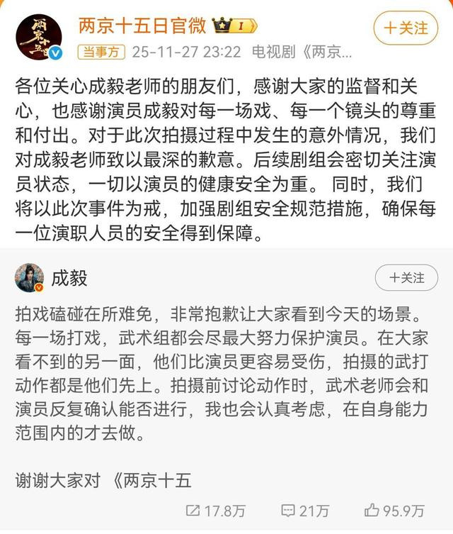 电视剧《两京十五日》官微转发表示,“各位关心成毅老师的朋友们,感谢大家的监督和关心,也感谢演员成毅对每一场戏、每一个镜头的尊重和付出。对于此次拍摄过程中发生的意外情况,我们对成毅老师致以最深的歉意。后续剧组会密切关注演员状态,一切以演员的健康安全为重。同时,我们将以此次事件为戒,加强剧组安全规范措施,确保每一位演职人员的安全得到保障。”